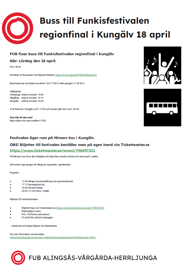 FUB anordnar bussresa till Funkisfestivalens regionsfinal i Kungälv 18 april