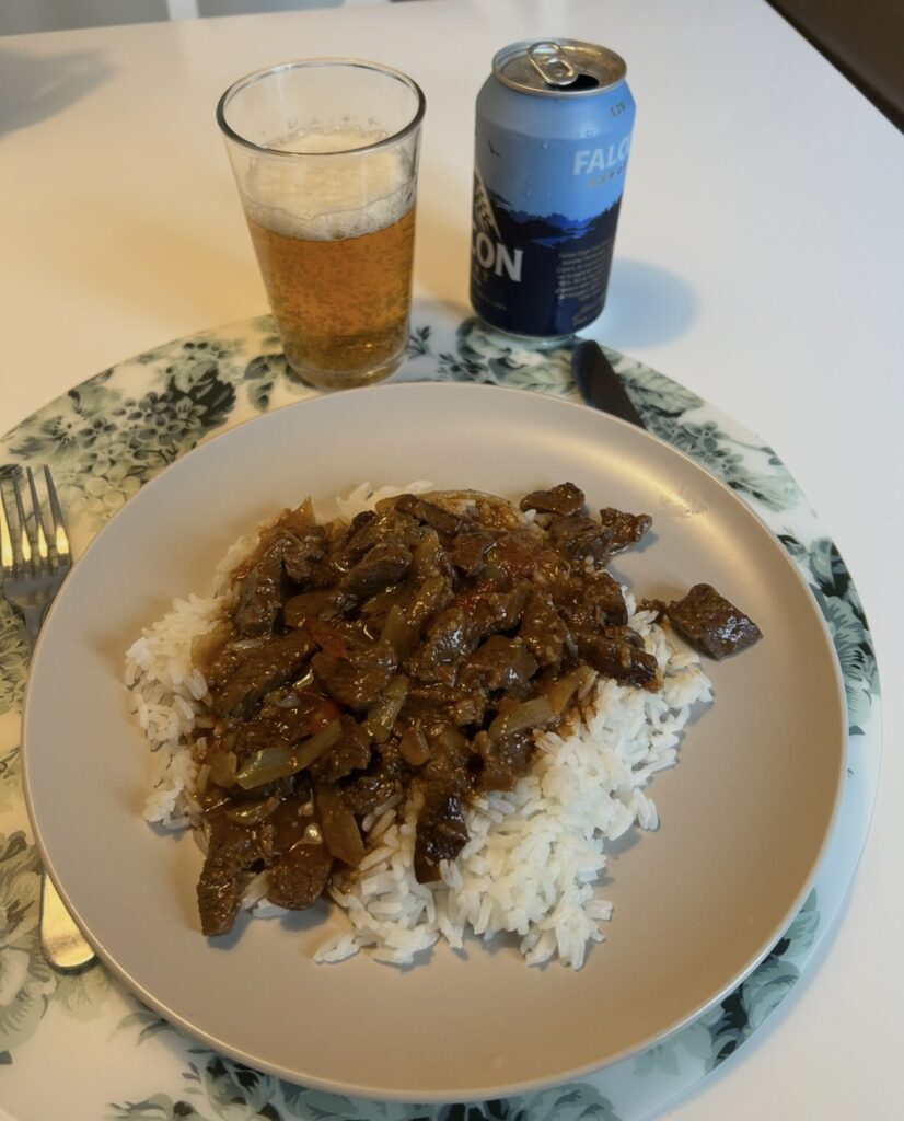 Smaksatt med lök, vitlök, buljong, kanel, kardemumma. Jordnötssmör kan man ha in, men hoppade över det. Maten var super god, 10 poäng. Mats är duktig. Till maten drack jag en ljus lager. Falcon.